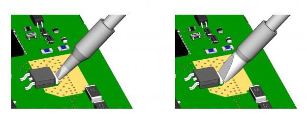 Gegenteilig verhält es sich mit zu schmalen Lötspitzen. In der linken Abbildung wird das Bauteil nur punktuell an einer viel zu kleinen Fläche erhitzt und Wärme fließt nur bedingt zur Lötstelle. Dadurch geht ein Großteil der Wärme verloren – viele Anwender neigen dann dazu die Temperatur zu erhöhen, in der Hoffnung das die stoffschlüssige Verbindung besser geschlossen wird. Dass diese Idee schlecht ist, haben wir oben im Artikel bereits erläutert.