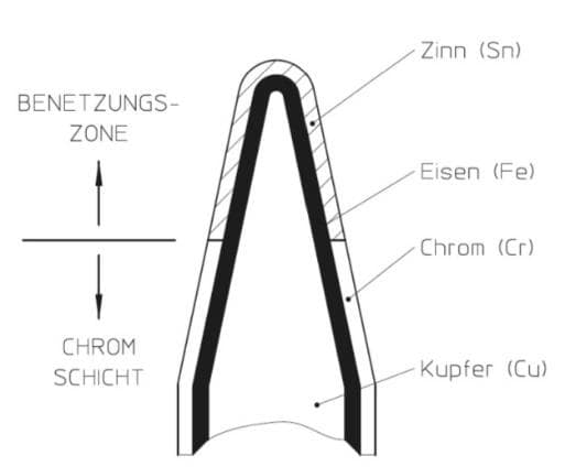 Die Benetzungszone hat die Aufgabe Lot aufzunehmen und ist im Auslieferungszustand häufig mit Zinn überzogen. Der Zinnüberzug dient als Aktivator um später im Produktionsbereich das frische Lot besser aufnehmen zu können. Die Chromschicht hingegen ist nicht benetzbar und hat lediglich die Aufgabe, die Benetzungszone zu begrenzen. Ohne eine Chromschicht würde sich das Lot auf der ganzen Lötspitze verteilen und zu Schäden an der Eisenlegierung führen. Die Kupferschicht dient aufgrund der metallischen Eigenschaften als exzellenter Wärmeüberträger, während die Eisenschicht zur Erhöhung der Lebensdauer einer Lötspitze beiträgt.